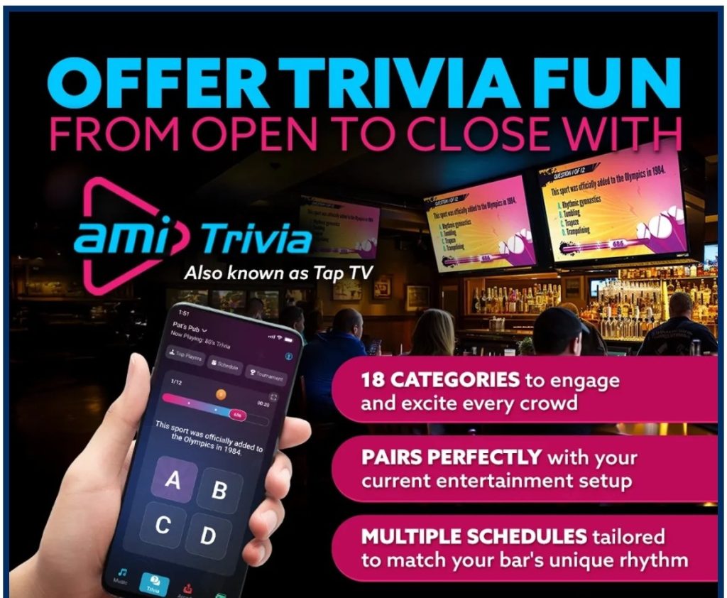 AMI Trivia uses a non-hosted, automated system that displays questions on existing bar TVs, while patrons use a free mobile app to submit their answers. This system offers: